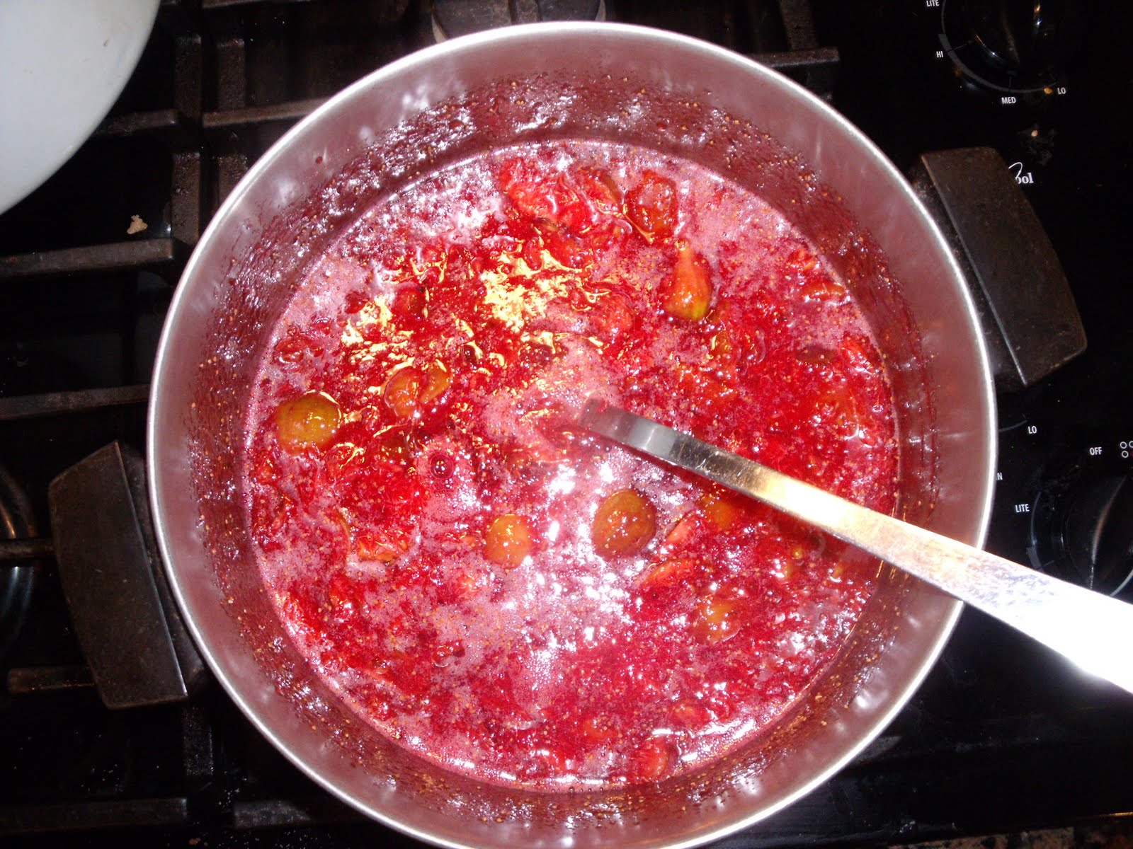The fig preserves finished and ready to eat. I made three batches, two are fig/strawberry, the other is fig/raspberry. I also put two gallon bags of figs in the freezer. I found a great recipe for a Fig Upside down cake in this month's issue of Paula Deen's magazine. It is wonderful.