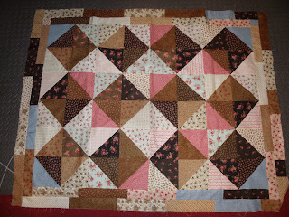 When they call this a lap quilt, they aren't kidding. I knew that it wouldn't be very large, however I thought it would be a little bigger. Ilove the colors and fabrics. I got this as a kit a couple of years ago at Sweet Home, the pattern can also be found at Moda Bake Shop. The pieces are big, you use a layer cake and it went together quickly, once I was determined to finish it. If I had been thinking at the time I would have bought two layer cakes and make it bigger. I think that after I get it quilted I will use it on a table. I like the pattern so well that I really think I would make it again, just a larger size.